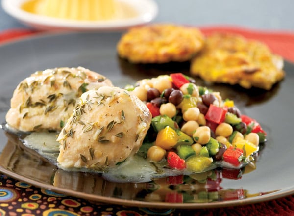 I am addicted to bell peppers and put them in anything i can, but summer corn, zucchini, tomatoes, and green beans would all taste great once they start showing up in markets. This delicious chicken salad with crunchy fresh bell peppers is delight to the palate. It's so satisfying, you won't miss the prep the salad ingredients. Remove the tops and seeds from bell peppers, then cut them in half lengthwise and cut into thin strips. Pat chicken thighs dry with paper towels.